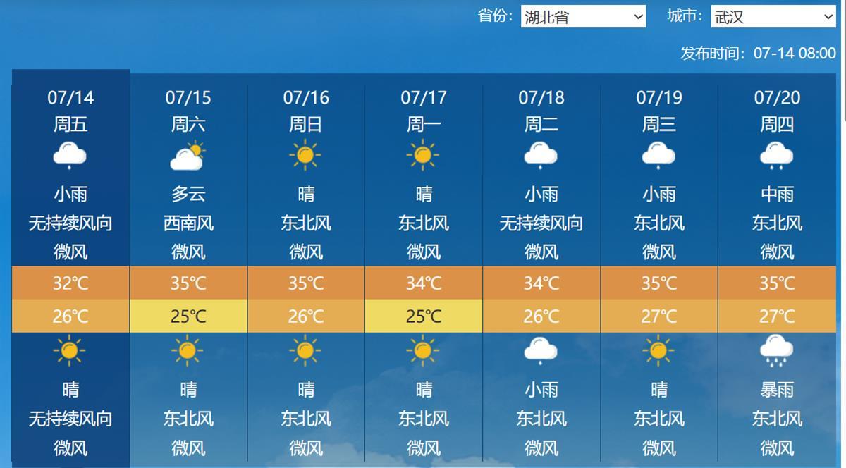 雨水,中断了武汉35℃+的高温接力跑,虽只能短暂降温,但你会发现未来一周武汉“大火”转“小火”,高温比本周所有下降,低温更是明显下降:本周五至下周四,武汉先晴后雨,最高气温34℃-35℃,中心城区在35℃-36℃,低温25℃-27℃,早晚不至于像这几天那么热烘烘的。