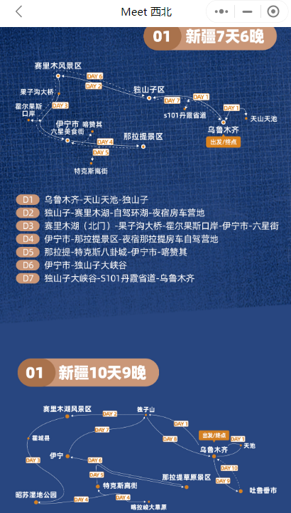 第一条是新疆7天6晚。从乌鲁木齐出发,途径-天山天池-独山子-赛里木湖-果子沟大桥-霍尔果斯口岸-伊宁市-那拉提景区-特克斯八卦城-独山子大峡谷-S101丹霞省道,最后回到乌鲁木齐。第二条是新疆10天9晚。同样从乌鲁木齐出发,途径天山天池-独山子-赛里木湖-霍城县-薰衣-昭苏湿地公园-喀拉峻草原-特克斯八卦城-那拉提景区-伊宁市-喀赞其-独山子大峡谷-S101丹霞省道-乌鲁木齐市-吐鲁番火焰山-鄯善库木塔格沙漠-鄯善县-吐峪沟-高昌故城-葡萄沟-坎儿井民俗园,最后回到乌鲁木齐。虽然这两条房车旅游路线的起点和终点都是乌鲁木齐,但其途径的地方是不一样的,看到的景观也有所不同,大家可以根据自己的需求预定。