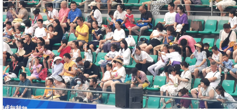 成都大运会的每一场比赛,都有数量众多家长带着孩子观战,一些坐席区甚至变成了“亲子看台”。