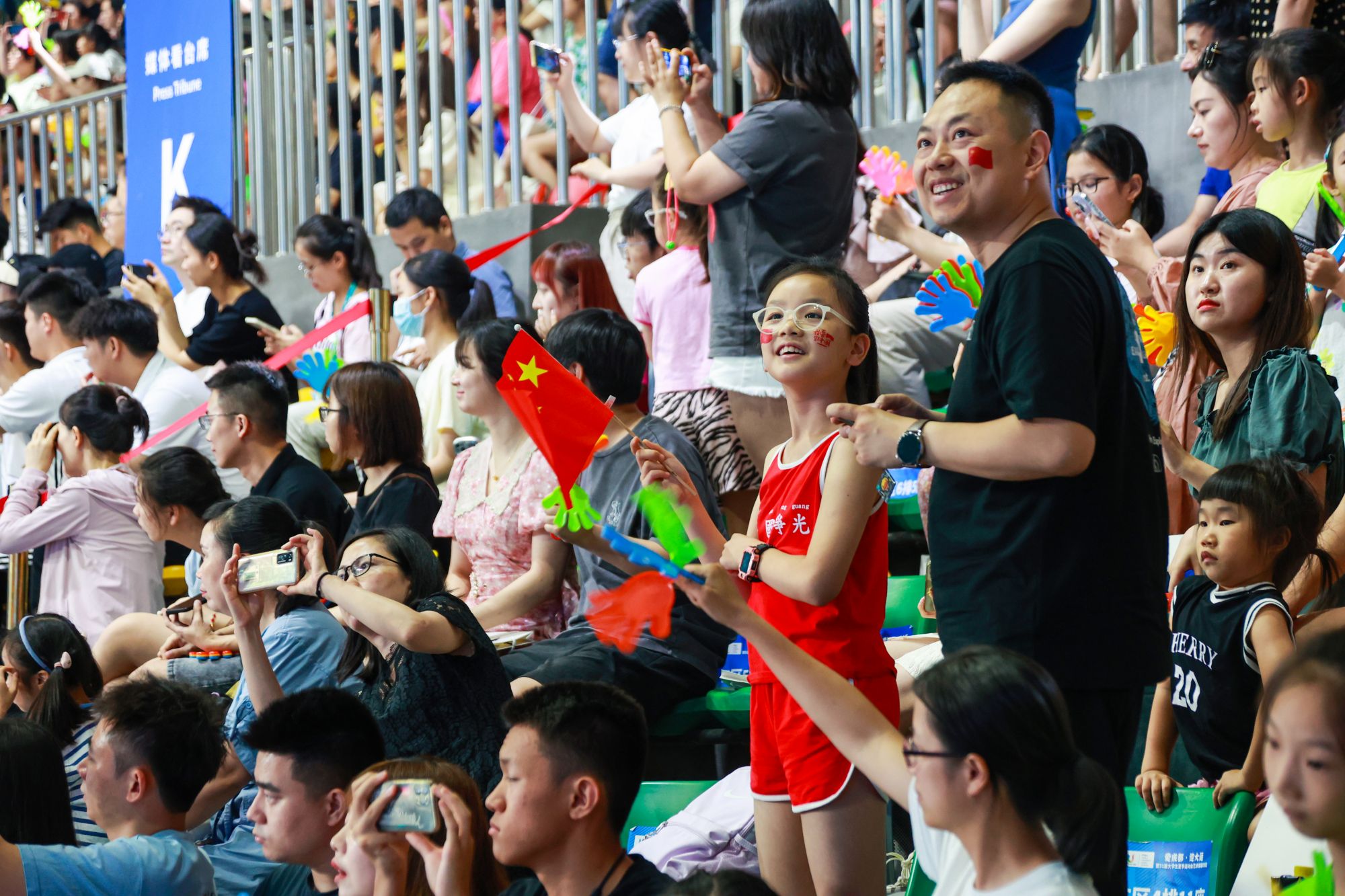 在大运会比赛现场,记者注意到,大部分赛场,观众中家长带着孩子占了七成以上,有些座席甚至变成了“亲子看台”。