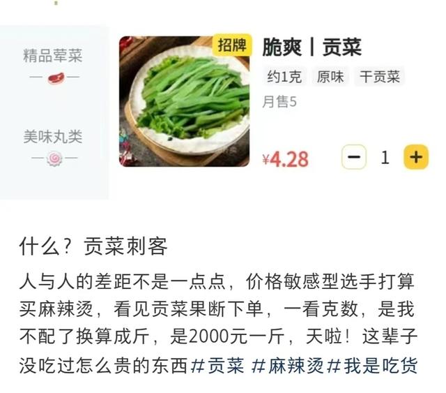 一碗麻辣烫能有多贵?新黄河记者打开外卖平台,从手机外卖端来看,金针菇4.28元(约50g),鹌鹑蛋4.99元(约50g),鲜豆腐3.98元(约50g),火锅宽粉4.58元(约50g)……即便是抛除因平台抽成的溢价,每一个都超过日常菜价。但在线下门店,杨国福推出的“按斤称重”并且荤素均价的策略,确实是打破了普通人的基本常识,毕竟很少有人会去在意“一斤究竟有多重”。