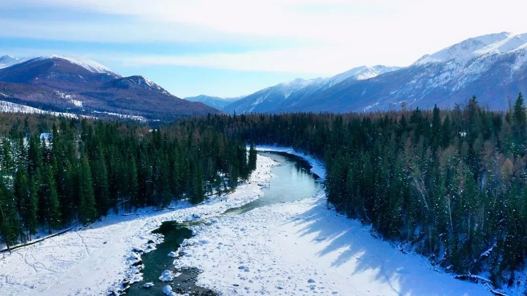 冬季的喀纳斯褪去秋的妩媚,一片素雅隽永,像是被尘世遗忘的仙境。