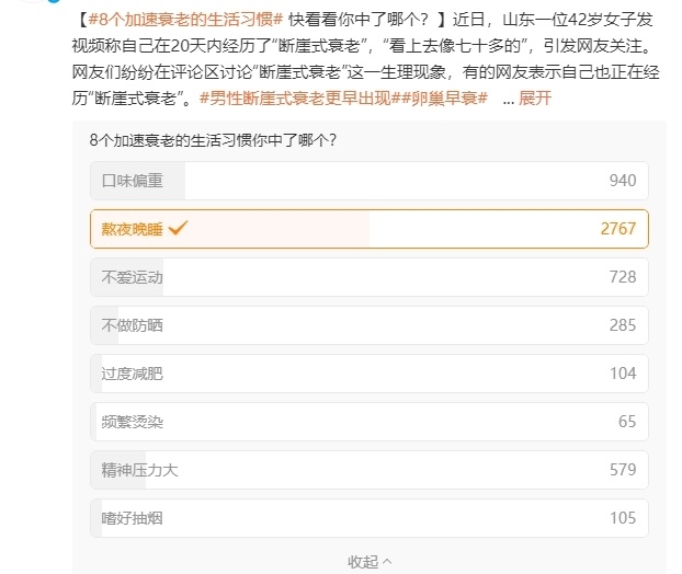 “断崖式衰老”的话题引发讨论后,有媒体发起投票,“8个加速衰老的生活习惯你中了几个?”五千余人参与,超半数的人选择了熬夜晚睡,位列第一。剩余几个高票选项分别为“口味偏重”、“不爱运动”、“精神压力大”。一位北京的网友称,“熬夜,乱吃乱喝,不运动,导致身体素质断崖式下跌”。