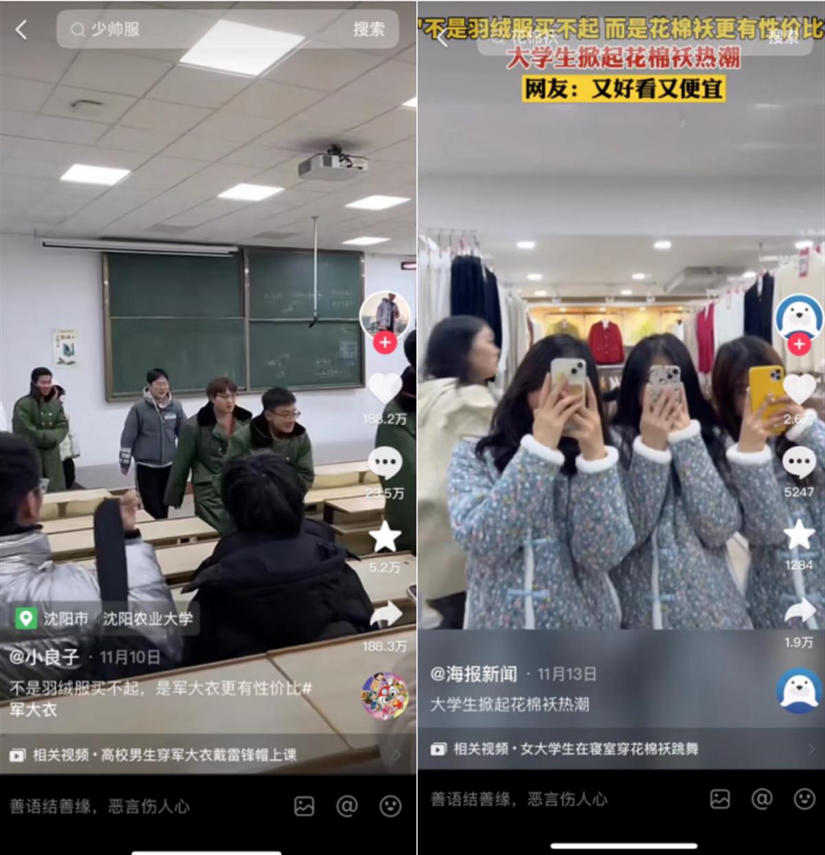 当一帮大学生穿着爸爸妈妈的军大衣和花棉袄,先后出现在短视频平台时,顿时引发了许多网友的热议,“时尚总是一个轮回,谁能想到老一辈的军大衣又出圈了”“今年的流行款,男大学生军大衣,女大学生花棉袄”“一个人穿是‘显眼包’,一群人穿就是潮!”
