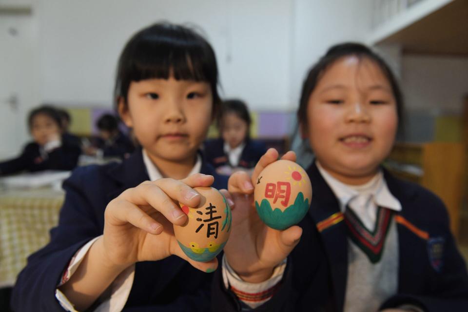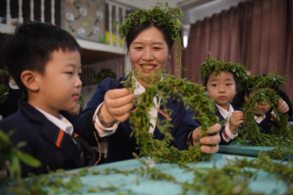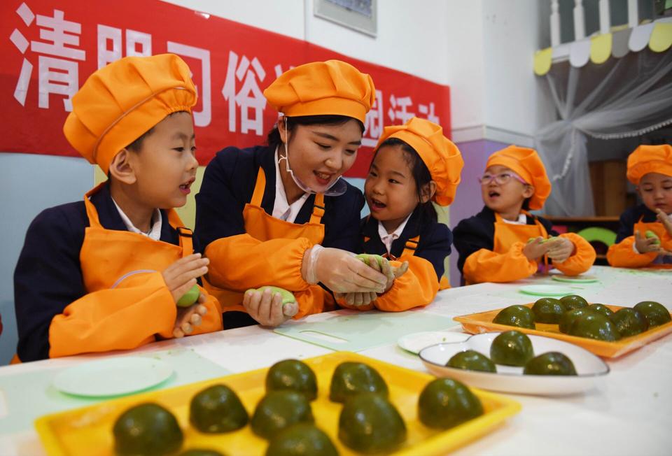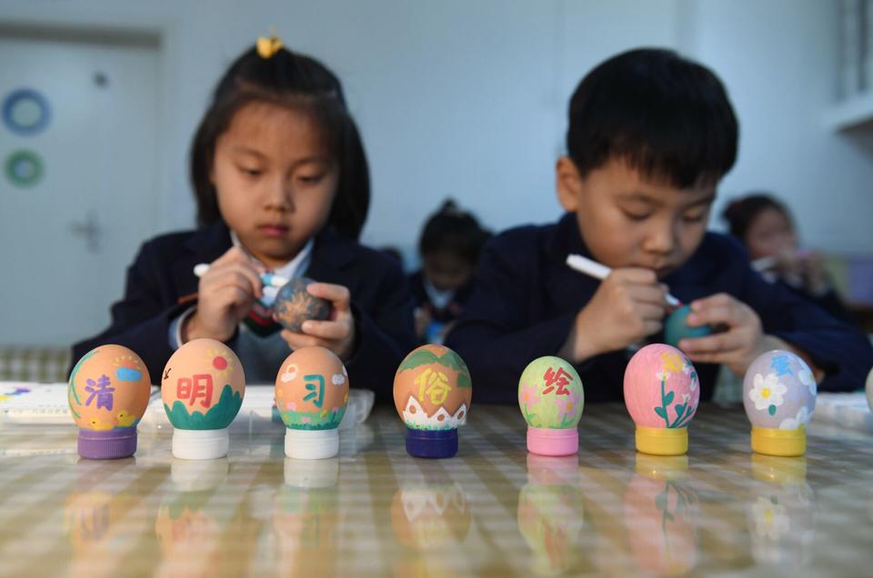 4月3日,临沂市郯城县郯城街道尚城嘉苑小区幼儿园,小朋友学习绘制彩蛋、制做青团,编织柳帽等活动。