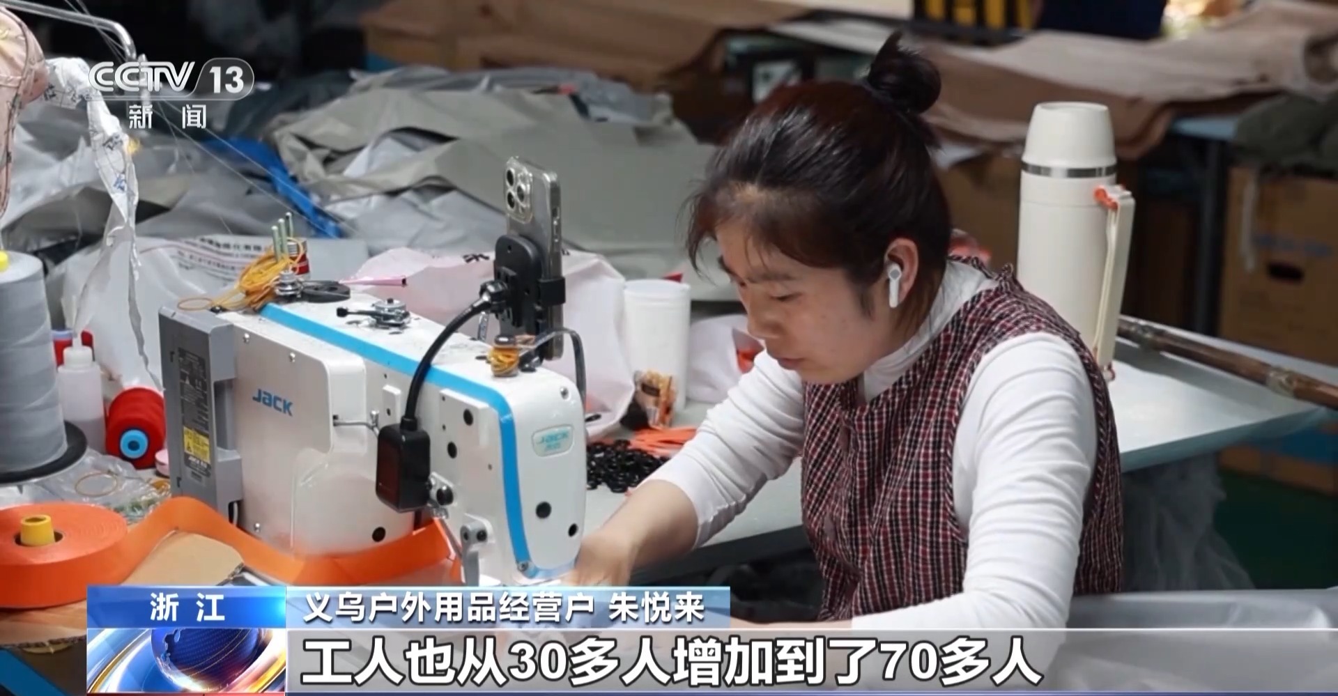 义乌户外用品经营户朱悦来:我们的生产订单增长20%以上,工人也从30多人增加到了70多人,但忙起来的时候还是不够用。