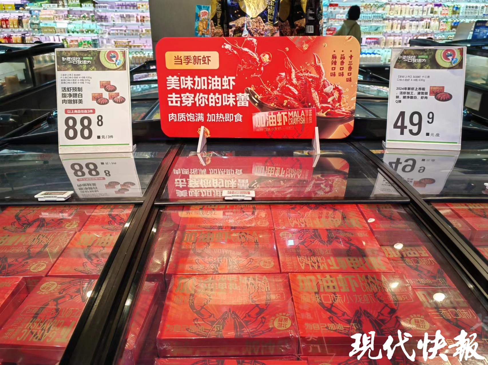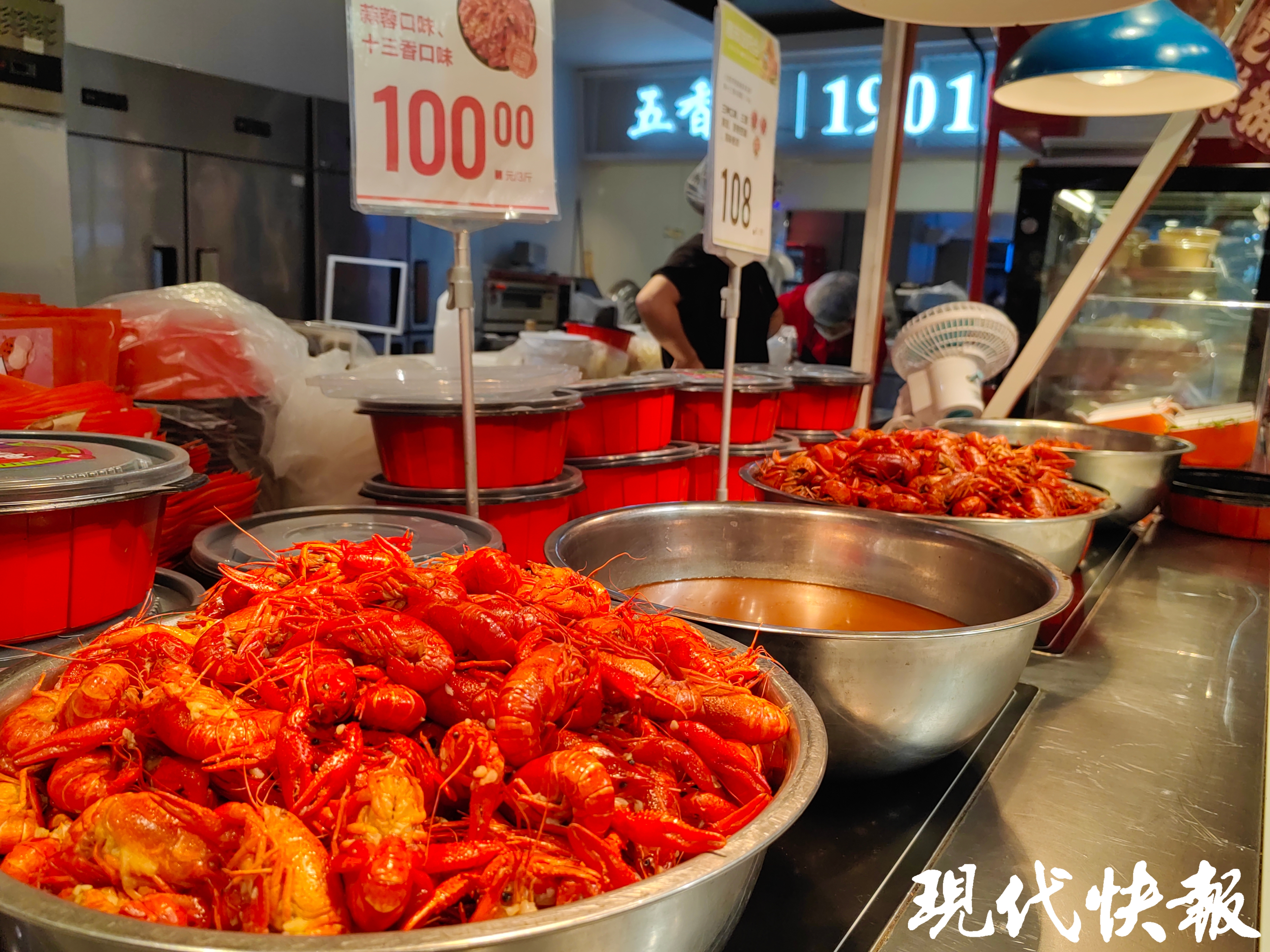 在龙虾馆,熟制龙虾价格走低。张府园附近的一家熟食店售卖蒜泥龙虾和十三香龙虾,价格从一个月前100元3斤到半个月前100元4斤,再到如今的89元4斤,一路下行。在一家连锁超市的熟食区,100元3斤的“小龙虾神鲜桶”吸引了市民围观,有蒜泥和十三香两种口味。
