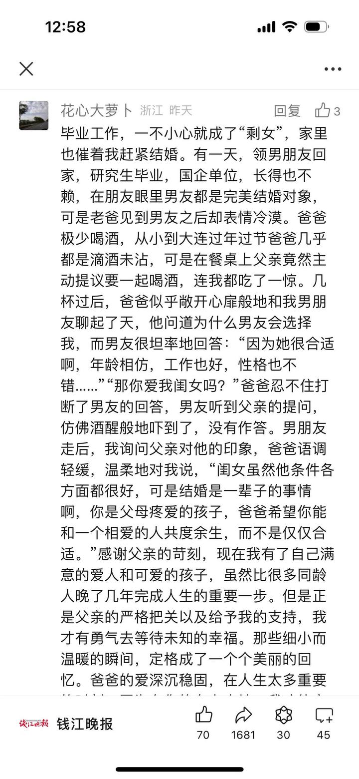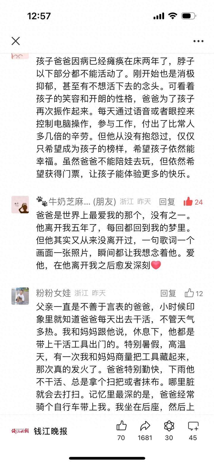 还有读者说,感谢潮新闻钱江晚报,总能在父亲节来临前让大家用不一样的方式致敬和告白父亲:“我记得去年是让大家拍爸爸的手(去年父亲节《爸爸的手》策划戳这里),那些父亲的手打动了我,每一双仿佛都会说话,每一双也都有自己承担责任的方式和故事。”