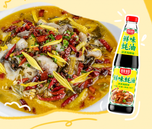 接下来,是这块“黄”的诱惑。黄色,总能勾起人们无限的食欲。脆滑爽嫩的生鱼片,在厨邦蚝油的腌调下,仿佛穿上了一层金色的外衣。搭配酸菜,成就了一道闪闪发光的金汤酸菜鱼。鲜滑酸爽的味道瞬间点燃味蕾,让人欲罢不能。