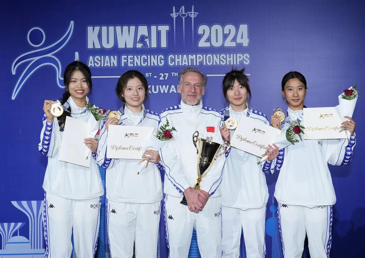 中国队获女子佩剑团体冠军(右一为饶雪怡)(图源:中国击剑协会)