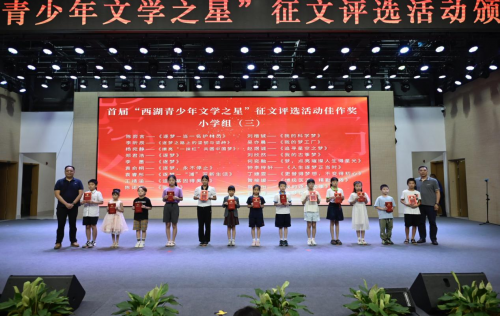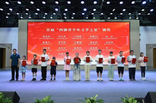为迎接中华人民共和国成立75周年,发现和培养西湖区青少年文学人才,繁荣发展西湖区青少年文学事业,助推西湖区打造“阅读第一区”和“科教文创高地,活力品质城区”建设,由中共杭州市西湖区委宣传部主办,西湖区教育局、西湖区文广旅体局、西湖区传媒中心协办,西湖区文学艺术界联合会、西湖区作家协会承办,杭州市作家协会、杭州育才实验学校支持的首届“西湖青少年文学之星”征文评选活动颁奖仪式暨“国际青少年文学共读共创计划”启动仪式,8月17日上午在杭州市育才实验学校育才厅隆重举行。来自全区各有关单位的领导和嘉宾、获奖学生和家长代表、优秀组织奖学校代表、区作协会员代表共300余人参加了活动。