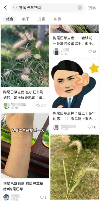 记者在网络平台上搜索“狗尾巴草”“点痣”等关键词,跳出了不少相关的帖子、视频。记者注意到,不少网友纷纷效仿从路边摘下狗尾巴草,经过一番清洗后便开始了“点痣大作战”。