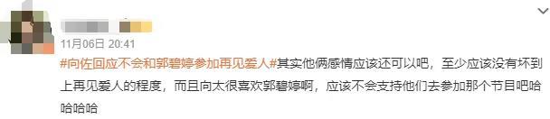 对此,有网友认为,既然两人感情稳定,就没有必要参加这类节目。但也有一部分网友表示遗憾,希望能看到他们在节目中的互动。还有一些网友开玩笑地说:“郭碧婷其实是嫁给了向太,而不是向佐。”