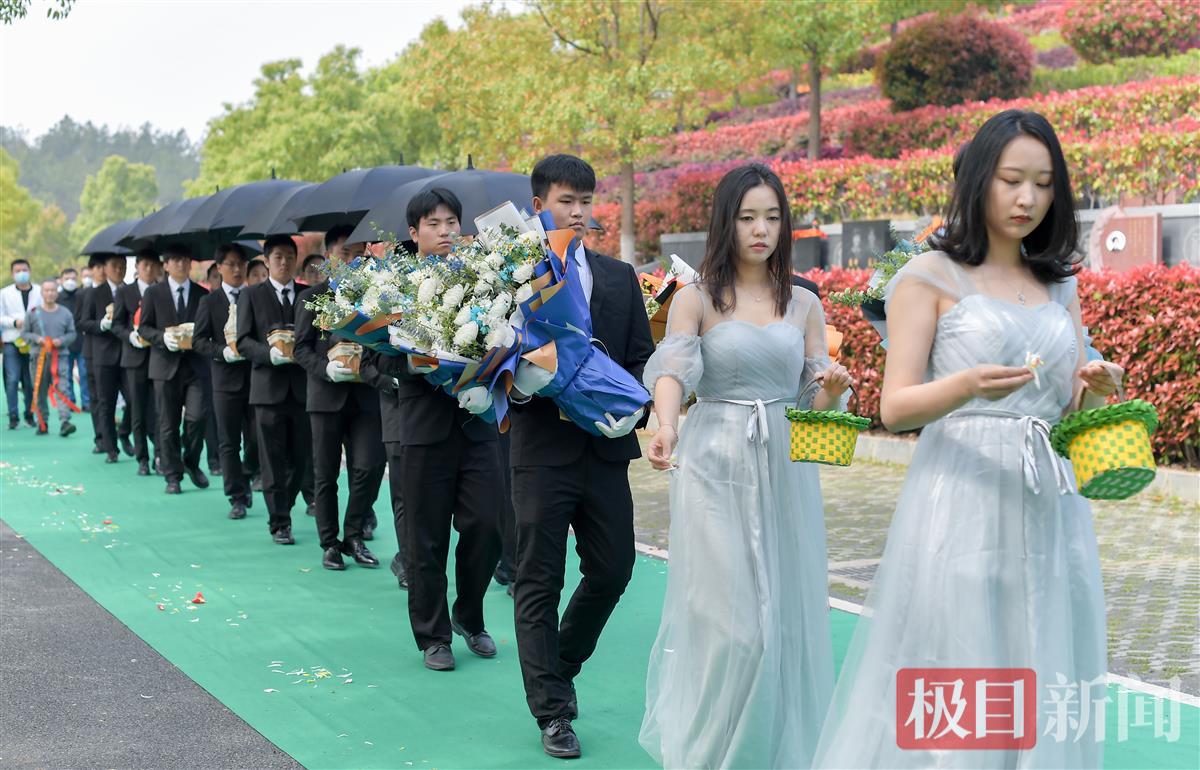 上午10时30分,活动正式开始,在轻柔舒缓的背景音乐下,4位身穿礼服的女司仪沿途撒花瓣引导,4名礼仪师怀抱花束领队,8个骨灰袋分别由8位男礼仪师小心翼翼捧护,8位女礼仪师为逝者执伞护送。安葬礼仪师们缓缓行至花葬区,行跪礼,按照事前准备好的穴位,小心翼翼地将盛放逝者骨灰的可降解骨灰袋安放落地,再轻轻撒满花瓣,深深三鞠躬为逝者送上最后的礼遇。整个过程在优美的小提琴现场演奏中进行。生命在一场没有烟火的优雅告别礼中回归于自然,与大地融为一体,与山水同眠,与花草相伴。