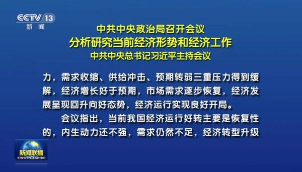 会议提到,我国疫情防控取得重大决定性胜利,经济社会全面恢复常态化运行,宏观政策靠前协同发力,需求收缩、供给冲击、预期转弱三重压力得到缓解,经济增长好于预期,市场需求逐步恢复,经济发展呈现回升向好态势,经济运行实现良好开局。