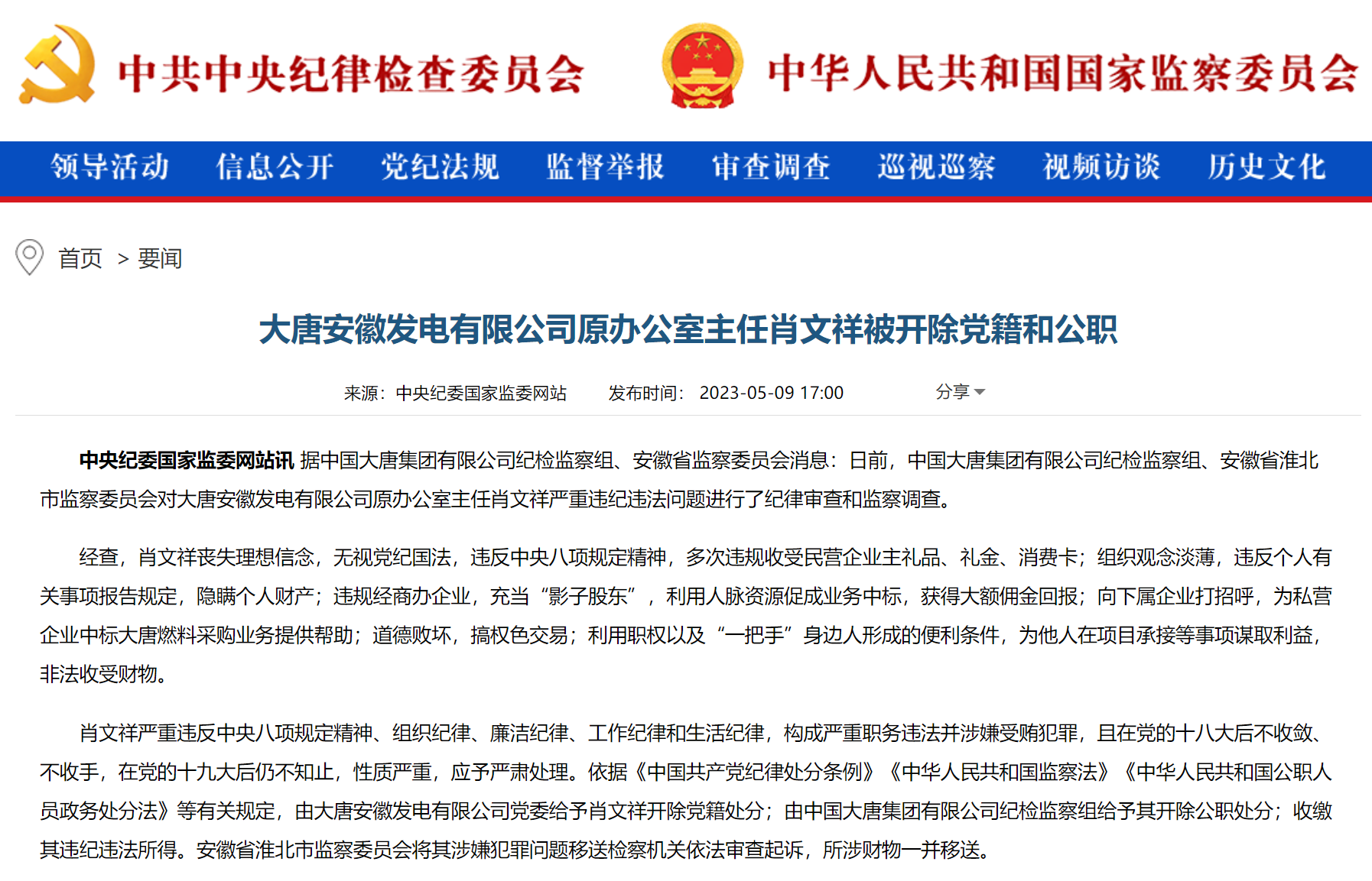 中央纪委国家监委网站5月9日通报据中国大唐集团有限公司纪检监察组、安徽省监察委员会消息:日前,中国大唐集团有限公司纪检监察组、安徽省淮北市监察委员会对大唐安徽发电有限公司原办公室主任肖文祥严重违纪违法问题进行了纪律审查和监察调查。