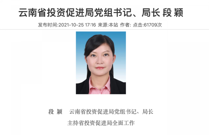 2021年1月,云南省委组织部发布省管干部任前公示公告,21人拟任新职,其中段颖“拟任省直单位正厅级领导职务”。同月,她的新职务明确——云南省投资促进局党组书记、局长。