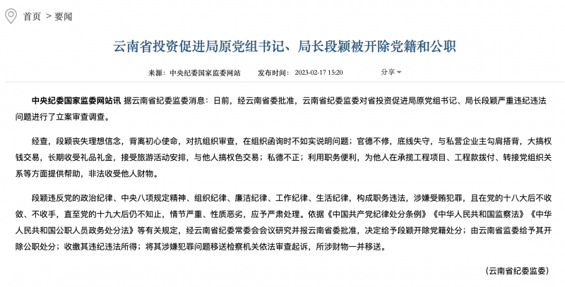 2022年8月9日,云南省纪委监委发布消息,云南省投资促进局党组书记、局长段颖涉嫌严重违纪违法,目前正在接受纪律审查和监察调查。