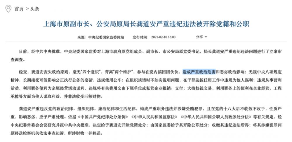 2021年2月被双开的上海市政府原党组成员、副市长,市公安局原党委书记、局长龚道安,通报中也提到了“造成严重政治危害”。