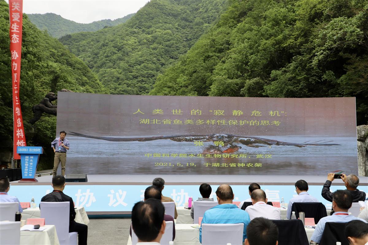 活动现场,神农架国家公园、宜昌市后河国家自然保护区、神农架林区红坪镇红举村就各自的生物多样性保护工作进行交流发言。中国科学院武汉植物园研究员江明喜、中国科学院水生生物研究所研究员张鹗,分别以《湖北省珍稀濒危植物保护研究纪实》和《湖北省淡水鱼类多样性现状及保护》为题,进行科普授课。
