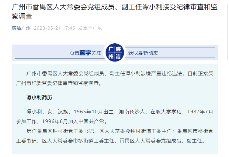 5月21日,据廉洁广州:广州市番禺区人大常委会党组成员、副主任谭小利涉嫌严重违纪违法,目前正接受广州市纪委监委纪律审查和监察调查。