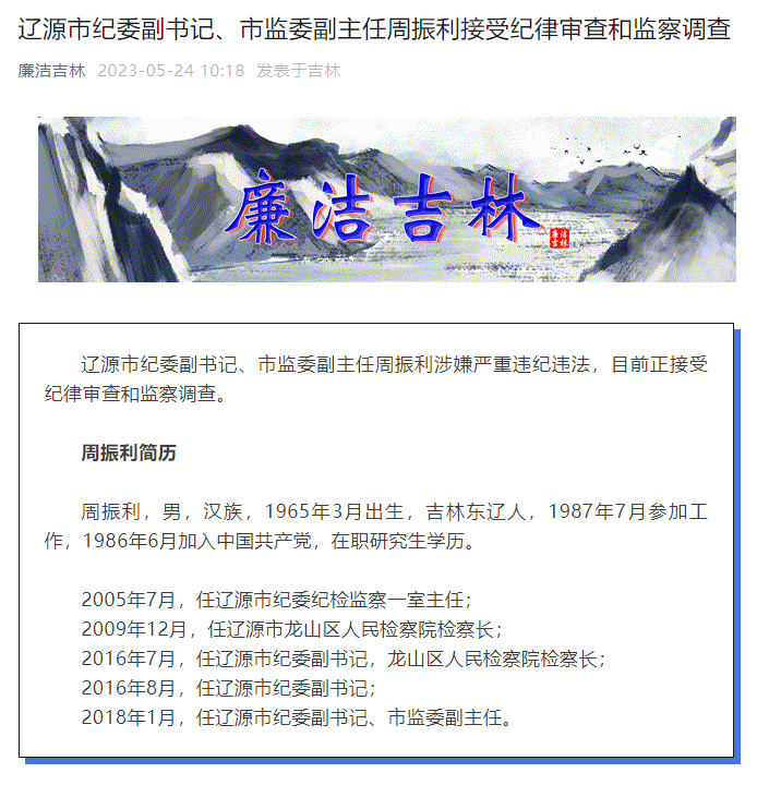 5月24日,据廉洁吉林微信公众号:辽源市纪委副书记、市监委副主任周振利涉嫌严重违纪违法,目前正接受纪律审查和监察调查。