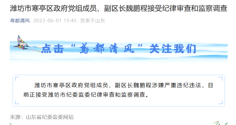 通报称,潍坊市寒亭区政府党组成员、副区长魏鹏程涉嫌严重违纪违法,目前正接受潍坊市纪委监委纪律审查和监察调查。