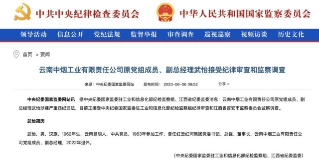 据中央纪委国家监委网站6月6日消息,云南中烟工业有限责任公司原党组成员、副总经理武怡接受纪律审查和监察调查。
