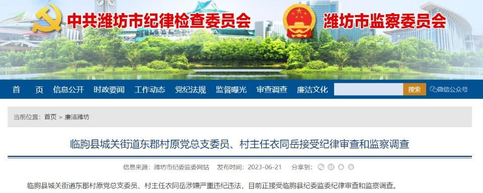 临朐县城关街道东郡村原党总支委员、村主任衣同岳涉嫌严重违纪违法,目前正接受临朐县纪委监委纪律审查和监察调查。