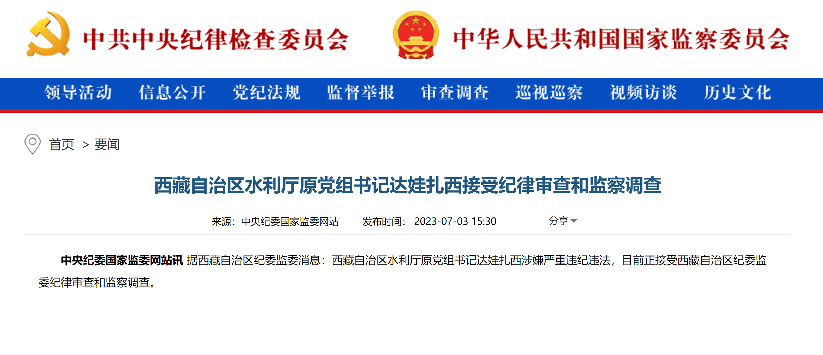 7月3日,据中央纪委国家监委网站援引西藏自治区纪委监委消息:西藏自治区水利厅原党组书记达娃扎西涉嫌严重违纪违法,目前正接受西藏自治区纪委监委纪律审查和监察调查。