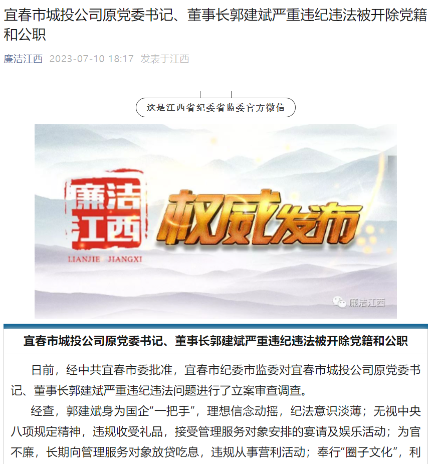 7月10日,据廉洁江西:日前,经中共宜春市委批准,宜春市纪委市监委对宜春市城投公司原党委书记、董事长郭建斌严重违纪违法问题进行了立案审查调查。