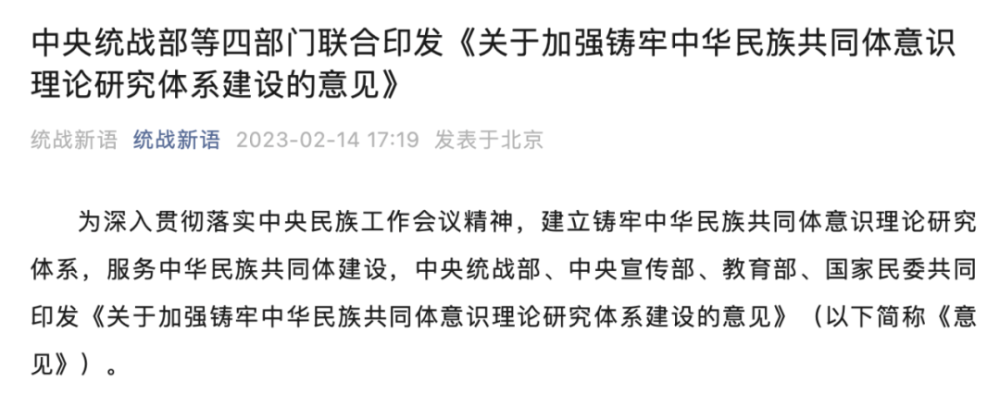 今年2月,中央统战部、中央宣传部、教育部、国家民委联合印发《关于加强铸牢中华民族共同体意识理论研究体系建设的意见》。