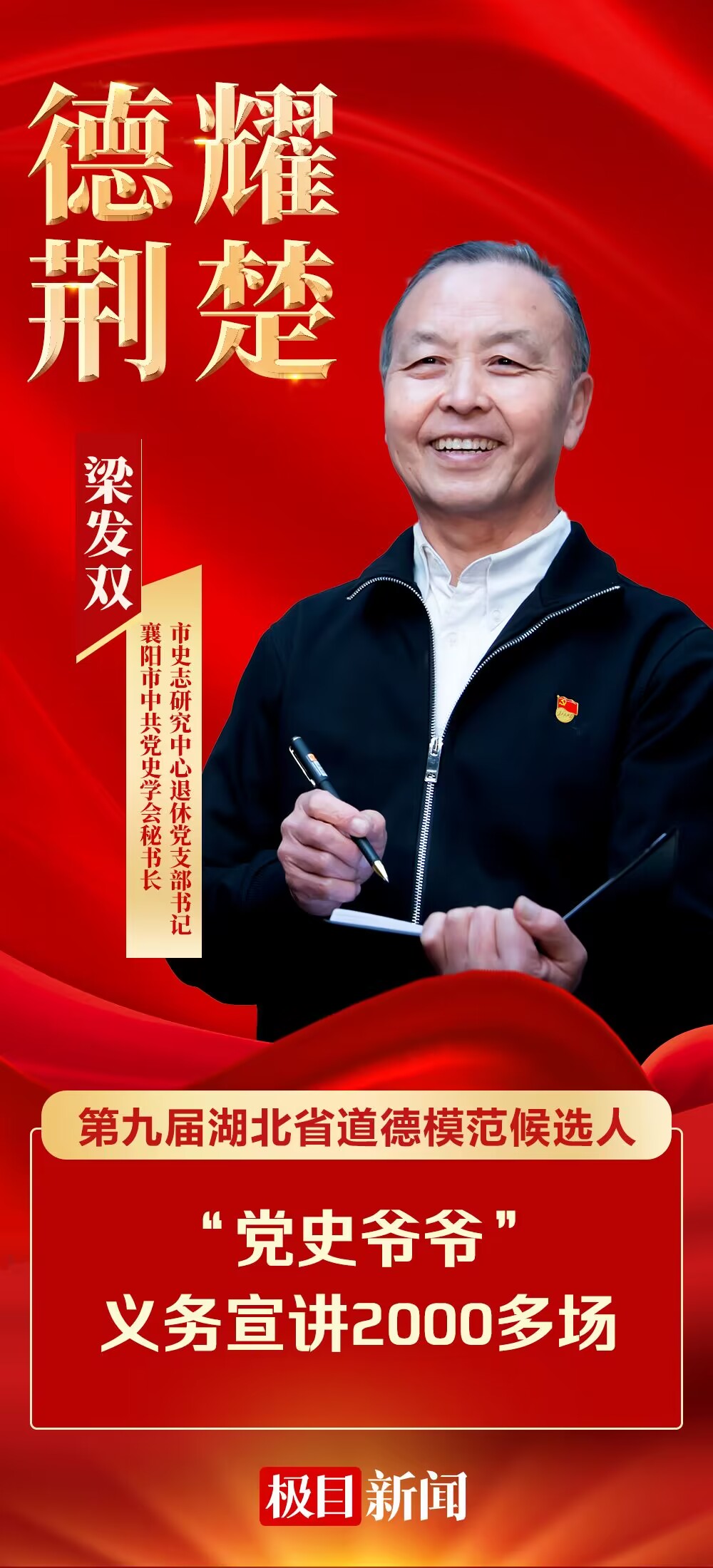 从2012年担任宣传科科长起,梁发双就开始了他的党史宣传员的生涯。2016年退休后,他更加热心党史宣传工作,他说,“宣传党史是我的责任,只要还能干一天,我就要把党的历史编纂好,讲解好。”退休8年来,不断有机关单位、学校、企业、社区登门邀请他去讲襄阳的党史,襄阳的故事,他一直坚持义务讲解。20多年来,他总共宣讲了2000多场,被襄阳的中小学生亲切地称为“党史爷爷”。