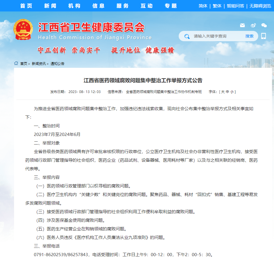 面对为期一年的整治工作,公告还公布了医药领域腐败问题集中整治工作期间的举报电话(0791-86202539/86257843),以及举报邮箱(jxyyzz@hc.jiangxi.gov.cn)。