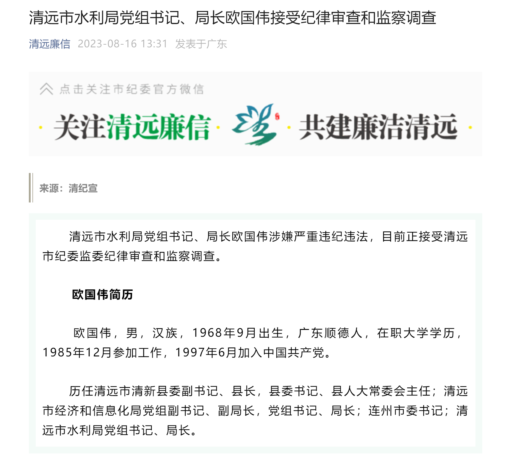 8月16日,据清远市纪委监委消息:清远市水利局党组书记、局长欧国伟涉嫌严重违纪违法,目前正接受清远市纪委监委纪律审查和监察调查。