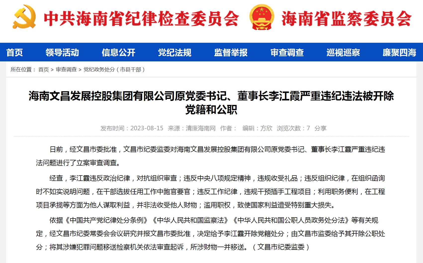 日前,经文昌市委批准,文昌市纪委监委对海南文昌发展控股集团有限公司原党委书记、董事长李江霞严重违纪违法问题进行了立案审查调查。