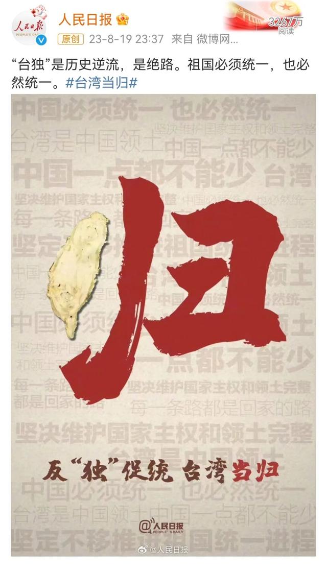 8月19日深夜,@人民日报 发微博表示,“台独”是历史逆流,是绝路。祖国必须统一,也必然统一。“台湾当归”立即冲上热搜第一。
