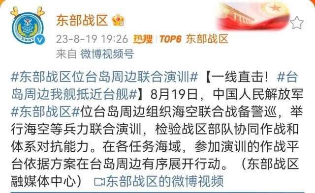 据央视军事消息,8月19日,东部战区位台岛周边组织海空联合战备警巡,举行海空等兵力联合演训。
