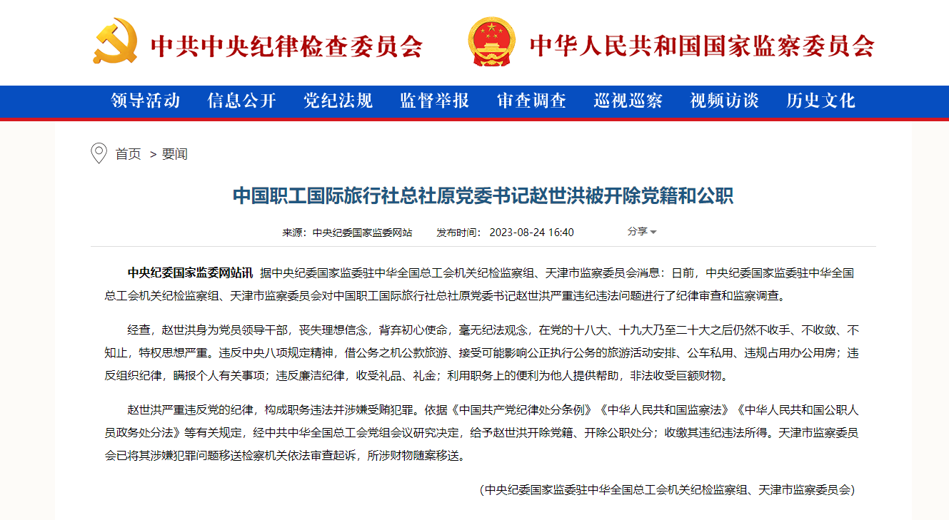 中央纪委国家监委网站讯据中央纪委国家监委驻中华全国总工会机关纪检监察组、天津市监察委员会消息:日前,中央纪委国家监委驻中华全国总工会机关纪检监察组、天津市监察委员会对中国职工国际旅行社总社原党委书记赵世洪严重违纪违法问题进行了纪律审查和监察调查。