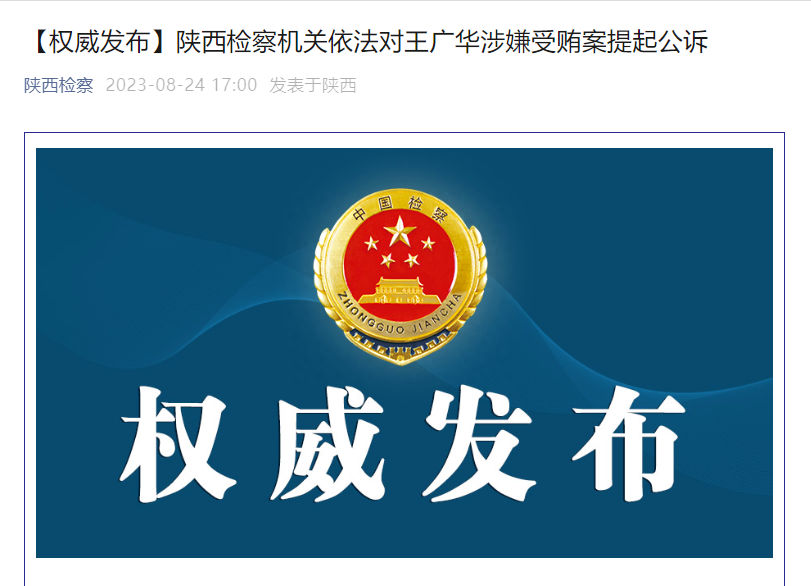 8月24日,据陕西检察:陕西省安康市交通运输局原党组成员、副局长王广华涉嫌受贿罪一案,由安康市监察委员会调查终结,移送检察机关审查起诉。近日,安康市人民检察院依法向安康市中级人民法院提起公诉。