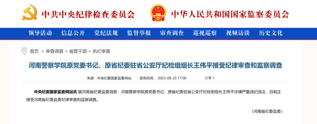 河南警察学院原党委书记、原省纪委驻省公安厅纪检组组长王伟平涉嫌严重违纪违法,目前正接受河南省纪委监委纪律审查和监察调查。