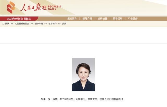 官方简历显示,胡果,女,汉族,1971年3月生,大学学历,中共党员,现任人民日报社副社长。