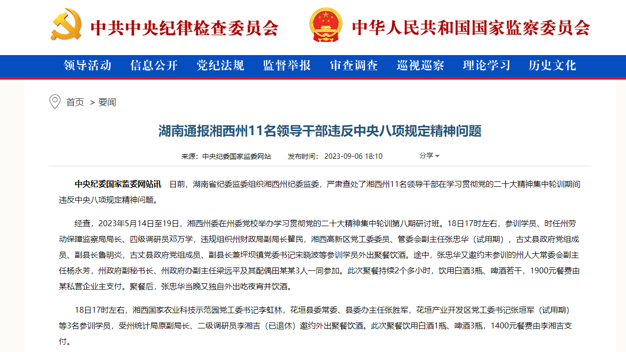 中央纪委国家监委网站讯日前,湖南省纪委监委组织湘西州纪委监委,严肃查处了湘西州11名领导干部在学习贯彻党的二十大精神集中轮训期间违反中央八项规定精神问题。