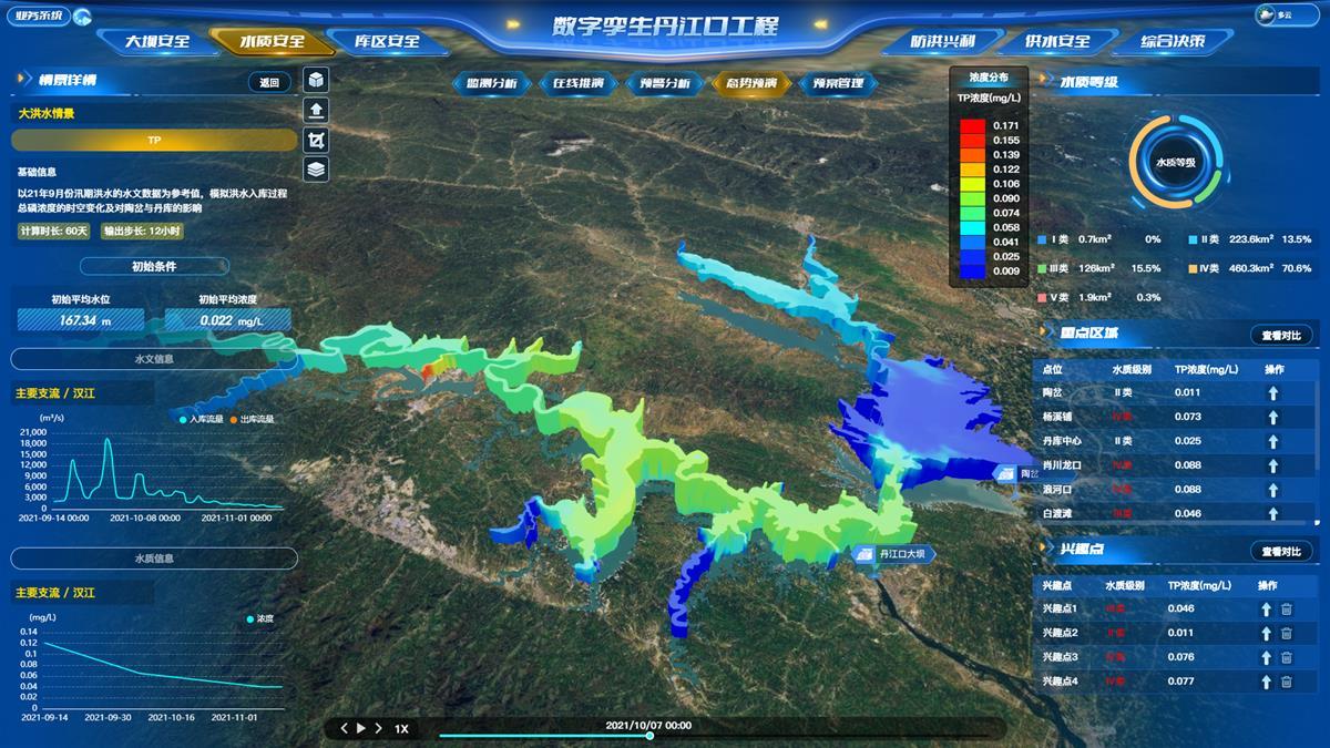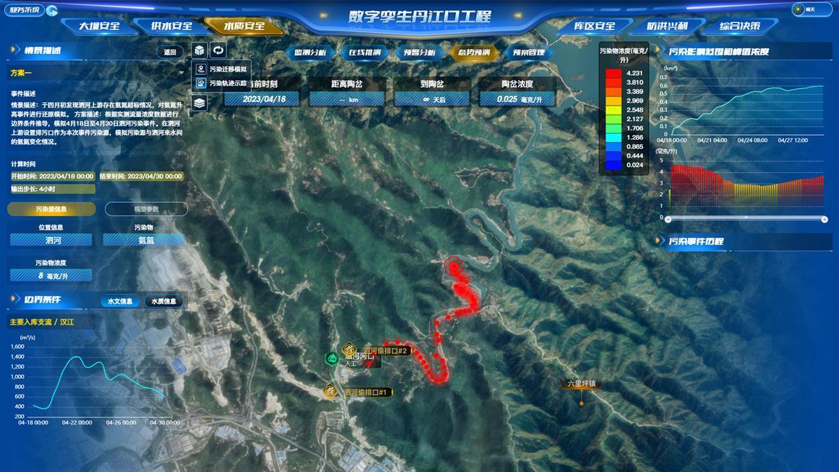 数字孪生丹江口水质安全模型,针对丹江口水库水深大、范围广、污染来源分散和类型多,以及丹库与汉库水动力交换复杂、水质呈现分区分层等特点,研发高效高精度三维水动力水质机理模型,并突破垂向动网格技术、污染反应动力学建模、污染团扩散追踪、加速算法等一系列关键技术,模拟出库区水流三维运动及污染物的扩散过程,通过模型集成与多业务有机融合,研发具有水质监测分析、在线推演、预警分析、态势预演、预案管理的水质“四预”应用体系,实现大洪水场景、库区和入库支流任意位置突发污染场景在线快速模拟,推送预警信息并评估预案处置效果,有效支撑水质污染扩散情况的实时预判分析。