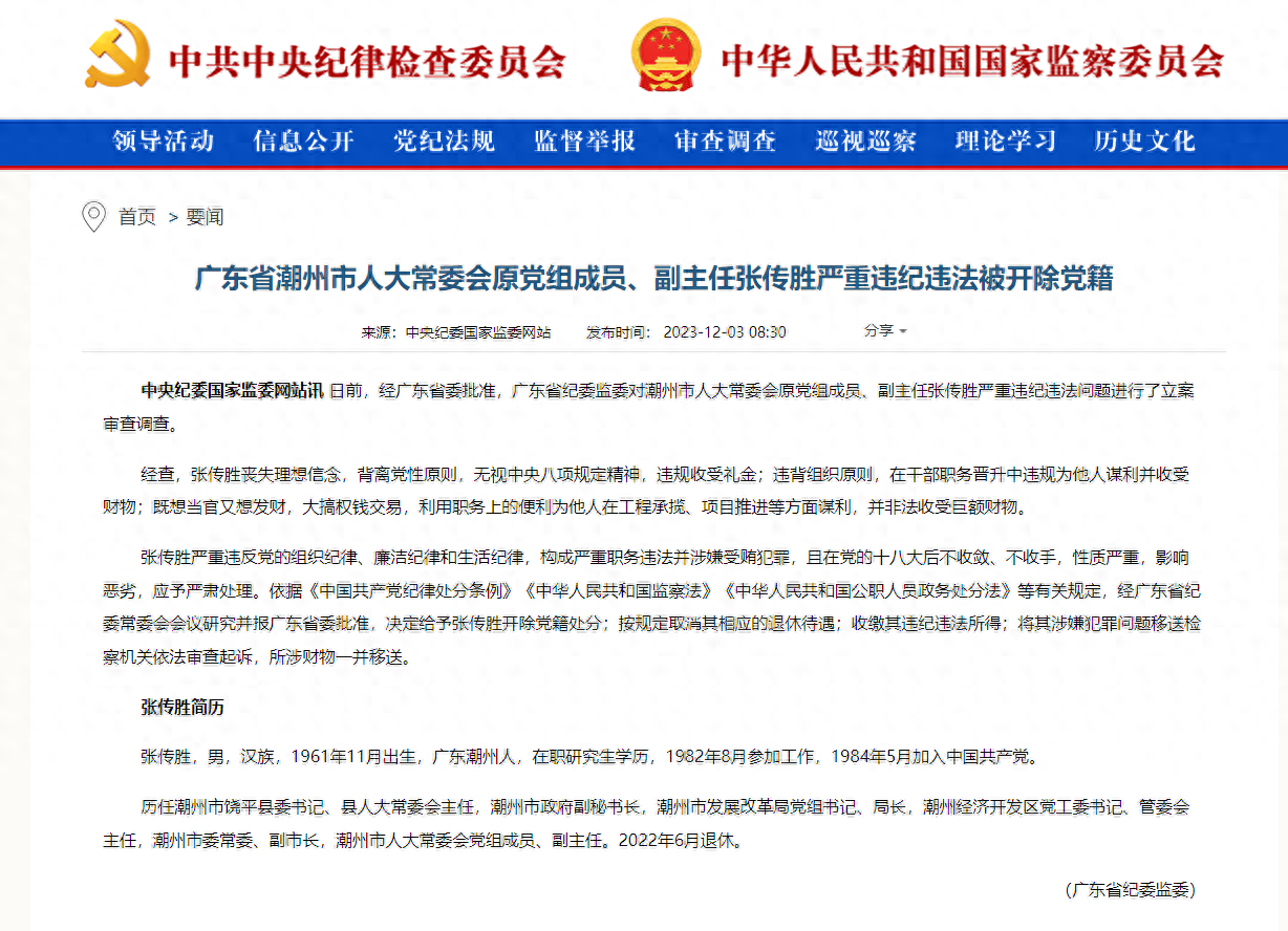 中央纪委国家监委网站讯日前,经广东省委批准,广东省纪委监委对潮州市人大常委会原党组成员、副主任张传胜严重违纪违法问题进行了立案审查调查。