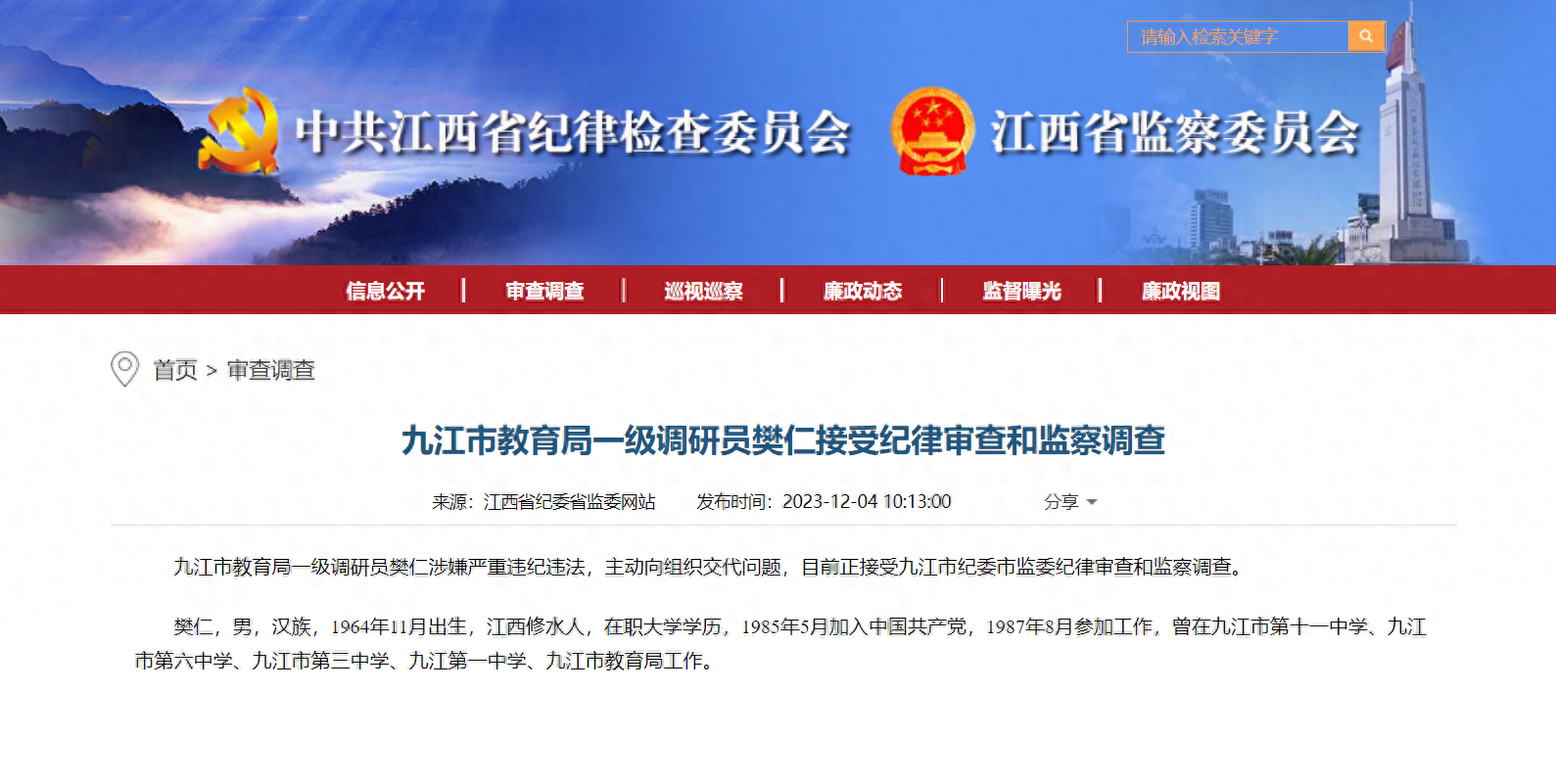 12月4日,据江西省纪委省监委网站消息,九江市教育局一级调研员樊仁涉嫌严重违纪违法,主动向组织交代问题,目前正接受九江市纪委市监委纪律审查和监察调查。