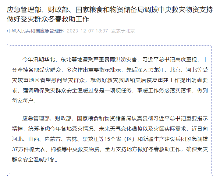 应急管理部、财政部、国家粮食和物资储备局认真贯彻习近平总书记重要指示精神,统筹考虑今年各地受灾情况、未来天气变化趋势以及灾区实际需求,近日向河北、山西、内蒙古、吉林、黑龙江等15个省(区)和新疆生产建设兵团紧急调拨37万件棉大衣、棉被等中央救灾物资,全力支持地方做好冬春救助工作,确保受灾群众安全温暖过冬。