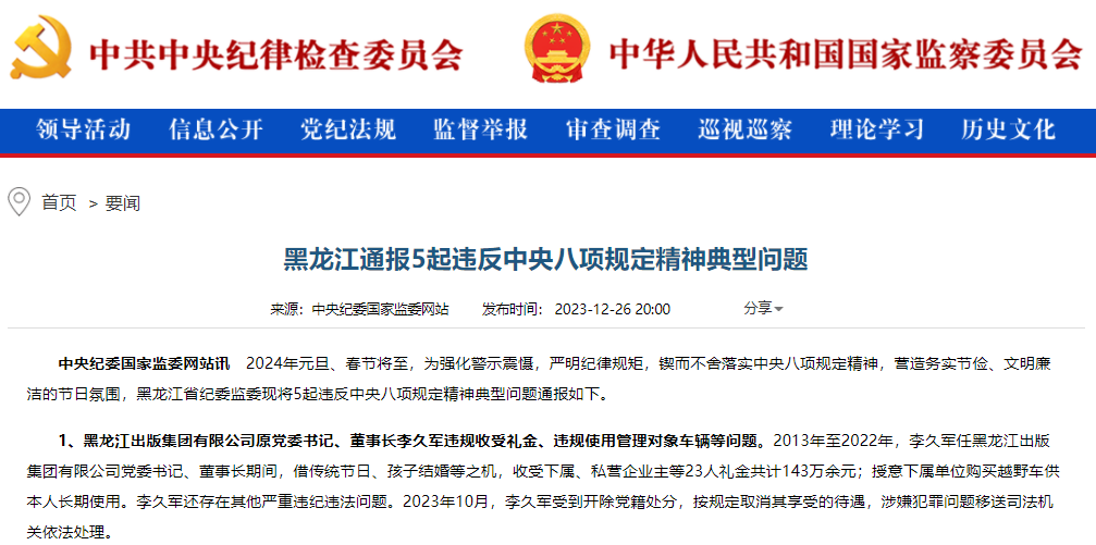1、黑龙江出版集团有限公司原党委书记、董事长李久军违规收受礼金、违规使用管理对象车辆等问题。2013年至2022年,李久军任黑龙江出版集团有限公司党委书记、董事长期间,借传统节日、孩子结婚等之机,收受下属、私营企业主等23人礼金共计143万余元;授意下属单位购买越野车供本人长期使用。李久军还存在其他严重违纪违法问题。2023年10月,李久军受到开除党籍处分,按规定取消其享受的待遇,涉嫌犯罪问题移送司法机关依法处理。