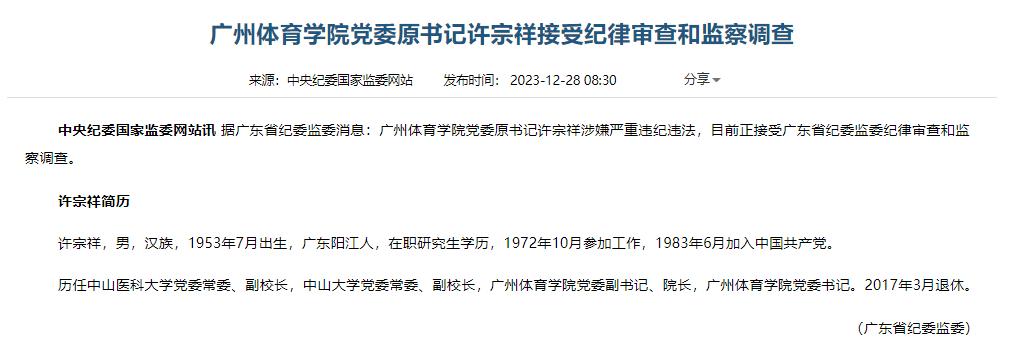 中央纪委国家监委网站12月28日讯据广东省纪委监委消息:广州体育学院党委原书记许宗祥涉嫌严重违纪违法,目前正接受广东省纪委监委纪律审查和监察调查。