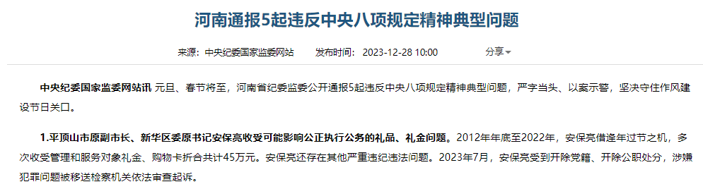 1.平顶山市原副市长、新华区委原书记安保亮收受可能影响公正执行公务的礼品、礼金问题。2012年年底至2022年,安保亮借逢年过节之机,多次收受管理和服务对象礼金、购物卡折合共计45万元。安保亮还存在其他严重违纪违法问题。2023年7月,安保亮受到开除党籍、开除公职处分,涉嫌犯罪问题被移送检察机关依法审查起诉。